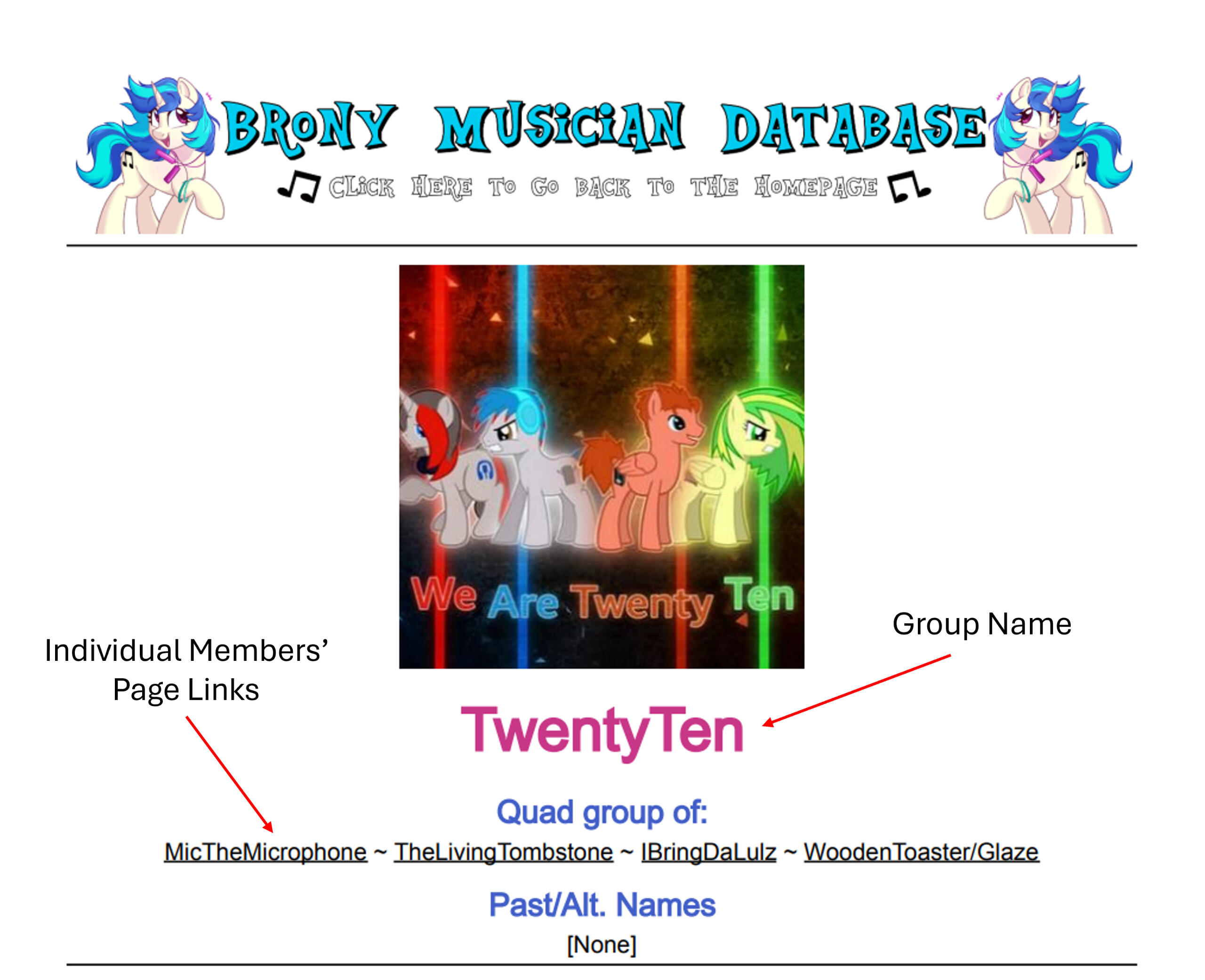 Brony Musician Database also hosts link pages for duo groups or bands. In a similar fashion to artists that made a new project with their new name, duo groups and bands will follow a similar principle: The links on the page will be specific for that group, but there will be links under the name that link to the individual musicians. Our example here is TwentyTen, which has four members that create their own, separate music & have their own separate pages on the Database.