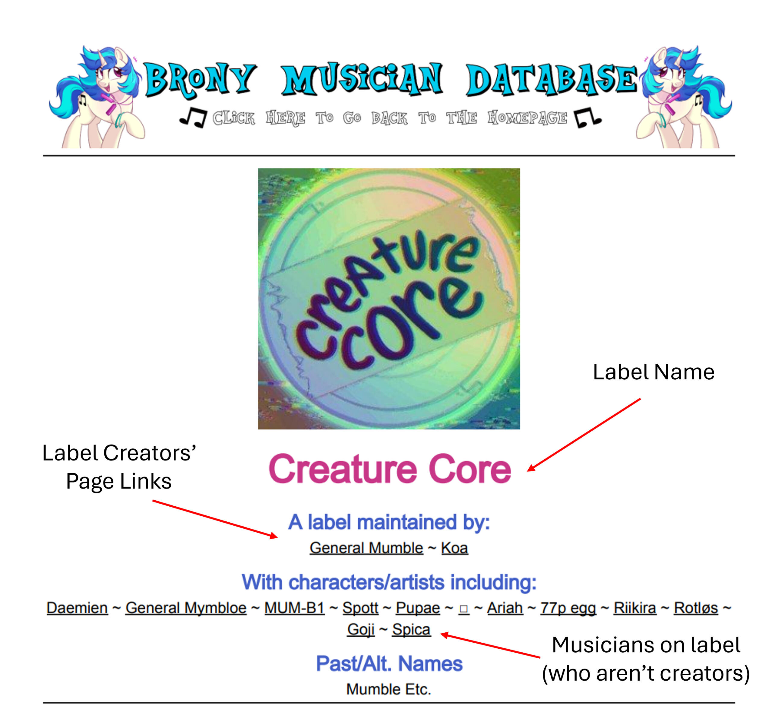 Brony Musician Database hosts up to 15 unique sites for musician content hosting, promotion, streaming, information, etc. It is split off in three major categories: "Social Links & Personal Site," "Music Information Links," and "Music Content Links. Each link is explained in more detail below.