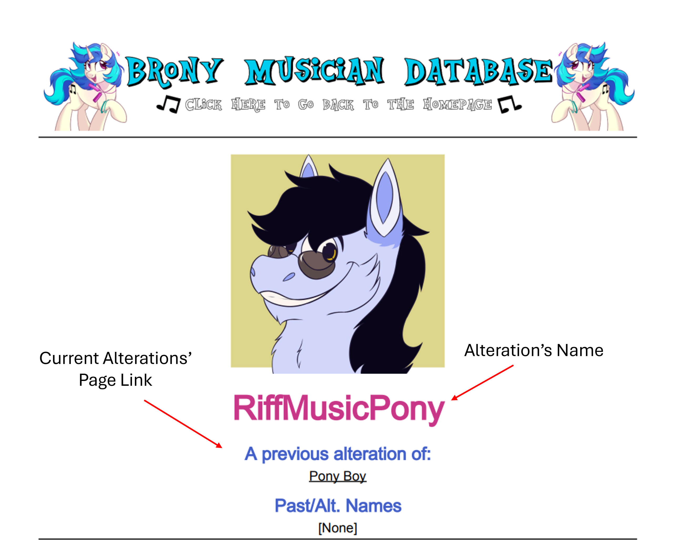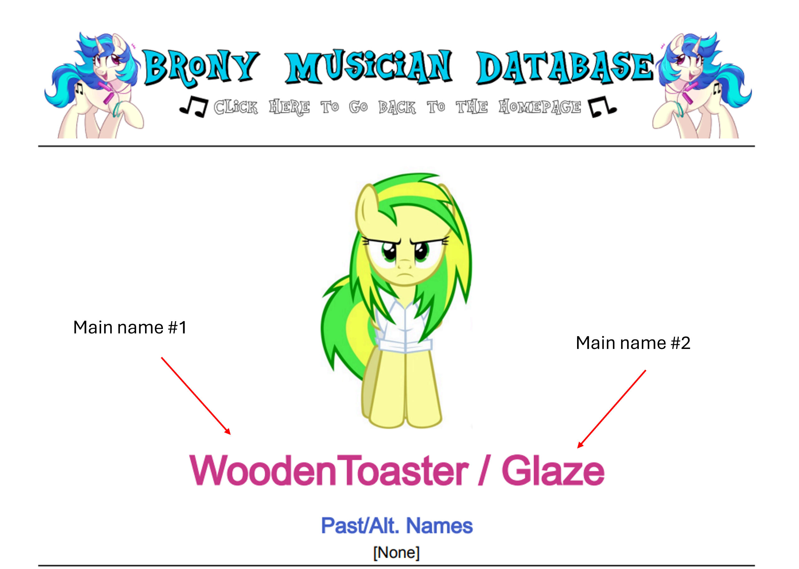 Over time, musicians either changed their names or made new projects. One issue with this on other music databases/sites is they either don't update the names or the name links are old names. Brony Musician Database attempts to showcase as many alt. names as we can while all linking to the same person.There are two different methods to how musicians changed their names: